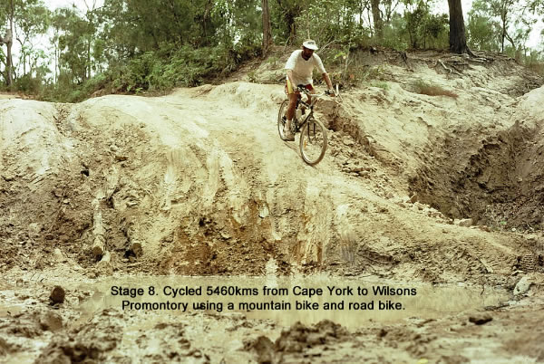 Augusta to Geraldton - Cycling from Geraldton to Wiluna - Walking from Wiluna to the Tanimi Track via the Canning Stock Route - Cycling the Tanimi Track to Alice Springs - Walk from near Alice across the Simpson Desert to Birdsville - Cycle from Birdsville to Cooktown _ Kayak from Cooktown to Cape York - and now I'm Cycling from Cape York to Wilson's Promontory as well as paddling a few special areas like Hinchinbrook Island.