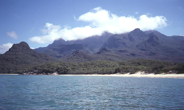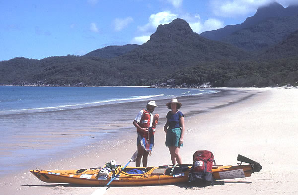 kayak, followed by a battle up a high sand dune. The struggle was worth it. The beach on the seaward side was absolutely magnificent, with the white sands stretching for kilometres to the north and several hundred metres to the south. Beyond the southern beach, Nina Peak and the distant mountains created a backdrop that was world class.