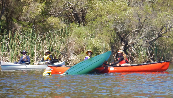 around South of Perth Yacht Club then it was an easier paddle under Canning Bridge and past Deep Water Point. After lunch, at the Mount Henry Bridge Reserve and a significant boost to the local café, we continued upstream past the posts with a pause to look at the sunken barge that was visible from the canoes due to the low tide. Actually,