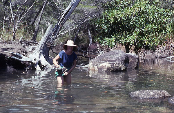 arrived. We camped in the trees, had a swim in the ocean, being careful not to get tangled in stingers, and then had tea. Later that night we sat out on the beach, staring into the full moon. It was brilliant apart from being annoyed by mosquitos. November 4th 1990. Hinchinbrook Island. Tim and I were up at 6am, and packed a rucksack with food, 5 litres of water and emergency gear, which included a long rope, knife, and First Aid Kit. Our walk started at 7.00am taking us past the lagoon and along the creek bed,