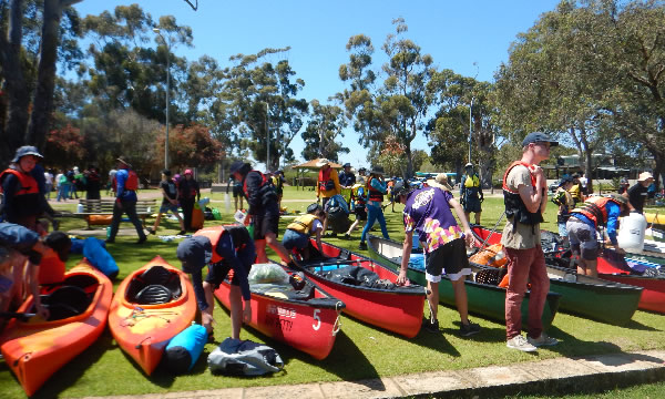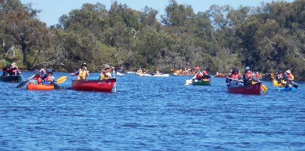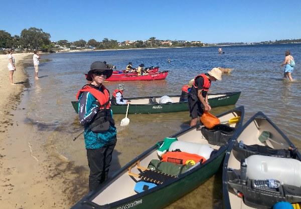 When all the Scouts had portaged their canoes around Kent St Weir, we emptied all the gear out of the boats and headed upstream so the Scouts could cool off while practicing some deep-water rescues. Good fun was had by all. After lunch and repacking the canoes we continued upstream. The front canoes got to admire all the paperbark blossom on the water and the birds on the banks. The following canoes saw only muddy water and empty trees. We arrived at our end point of Hester Park mid-afternoon; hot, tired