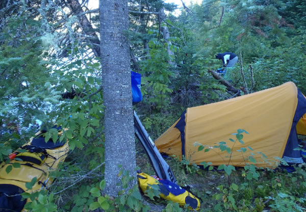 I jumped out to check. It wasn’t level, but there was a tiny clearing so it just had to do. We shivered as we heaved the kayaks up the steep bank underneath the branches of a pine tree. When we got the kayaks up there really wasn’t a lot of room for the tents but we found another spot a few metres upstream.
