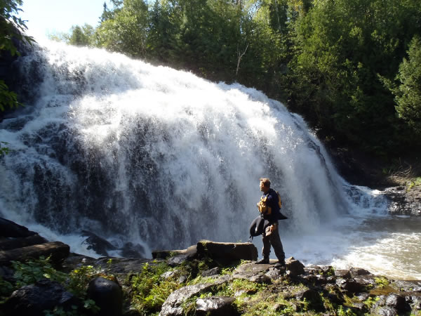 it was such a relief. A little further we stumbled on a high waterfall and thank god we stopped to check. At the waterfall we had that long 20 km portage, but because it was the first portage that involved tracks we could use our trolleys for the first time. It was much easier, but it took us all day to get to our next destination, Lake Superior