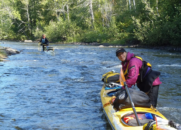 we leapt back in and dangled our feet overboard as our ride was usually short lived. Just before, or when the kayak crunched over a rock we would leap out and steer it around the boulders again. It was tedious work but much quicker and easier than portaging. After another 45 minutes of scrambling through the shallows we hit deeper water and