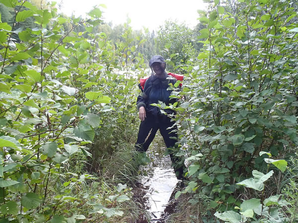It was difficult finding a place to erect our tents. Tuesday 6th September There was a real chill in the air and when we surfaced there was frost on the kayak and the clothing we had left out was as stiff as a board. Because we had finished most of the portages I thought we deserved an extra rest so I didn’t rustle the gang until 7.45am, 45 minutes after we usually get up. It was so cold so immediately I had to find my neoprene gloves to warm my hands. We had a cereal breakfast and a hot cup of tea before leaving our makeshift camp in the hope of finding some sun. Pushing the boats into the water was fairly easy but getting in them without stepping in the mud was much more difficult. With our legs tucked inside the cockpit we tackled the first rapid which was only a few metres away from camp. There was supposed to have been a portage track close by, but we didn’t see it. We managed to paddle down the first small drop before it shallowed and we had to get out and face the freezing water. Here began the start of a fairly long walk. We stumbled along much of the time leaning on the kayak and using it as support, but when the water deepened