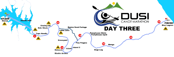 Stage Three is 36km from Inanda dam to Blue Lagoon in Durban, starting with 4km of flatwater on Inanda dam and ending with 10km of flatwater on the tidal estuary into the finish. Each finisher receives a Dusi medal and a commemorative race garment. The race prize giving takes place at Blue Lagoon after the final