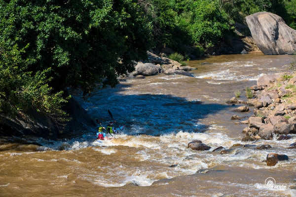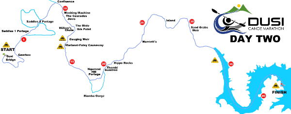 far larger uMngeni River and the river becomes more challenging, with some rapids rated Grade 3+, and some of the trickier rapids like Island 2 is portaged by most of the field. Most of the large rapids can be portaged if desired. Safety crews and divers are stationed at some of the major obstacles and rapids. The route is not marked and the onus is on the paddlers to learn the route