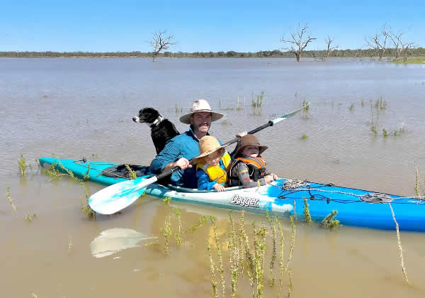 Lake Pinaroo is again navigable by kayak! We can’t quite believe we have seen Lake Pinaroo fill twice in three years, when it has been decades between these events in the past. Our family has been enjoying cool dips in the lake in their downtime, and even Nell squeezed in for a trip back of the kayak! The wildlife is loving it too, with birds flocking to the area and tadpoles and shrimps thriving since ex-Tropical Cyclone Kirrily