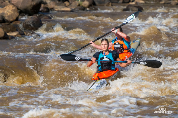 attracting between 900 and 1600 paddlers each year. Paddlers can choose between normal marathon K1s, K2s or even K3s (yes a K4 has even finished the Dusi). These boats need to be of robust construction to be able to take the knocks dished out by the rocky river, and must have an overstern rudder. Paddlers must wear a splashcover (spraydecks) and lifejackets (PFDs) and, if very