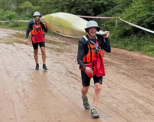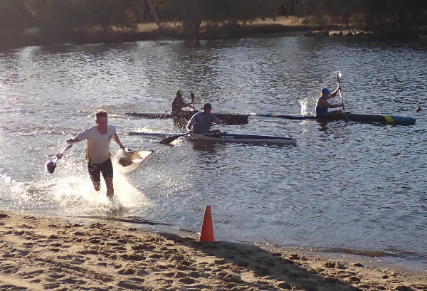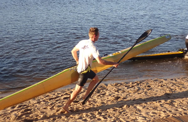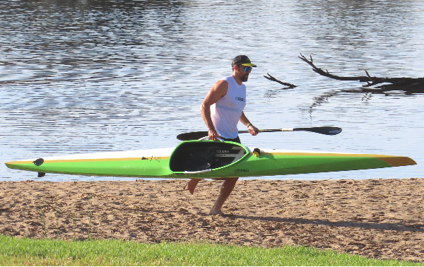 Luke Dooley doing a portage is out of the water quickly and trying to get back in and keep up with the paddlers not portaging.