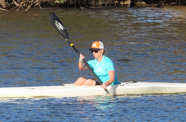 Jill started off paddling a heavy plastic club ski, but she still got it moving at an amazing speed. Her PB for the 3.8km course with 6 U turns in this heavy plastic ski is 23 minutes & 23 seconds.