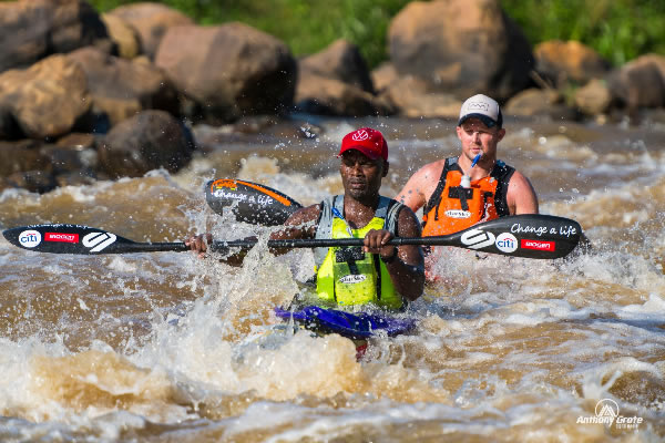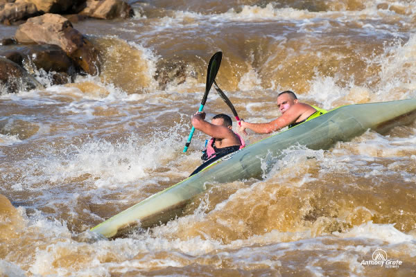 lines did not exist and we went blind into so many rapids. Gordon did a superb job of keeping the boat up as I smashed into the stoppers and literally disappeared. Finally, we hit mango rapids and as the last major one it delivered some bruising rock hits to the hull, but the seams held and we were now on the 14 km haul to the finish. We dug deep and pushed on and were never so glad as to see the finish line. Even after all the training we were spent. We had drunk over 6 litters of liquids from