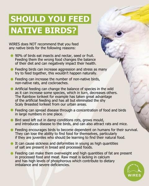 To feed or not to feed? While it may seem like a kind gesture, WIRES advises against feeding native birds for several crucial reasons. Read through to understand the impact artificial feeding can have on their health, behavior, and the delicate balance of our ecosystems. Native birds thrive best