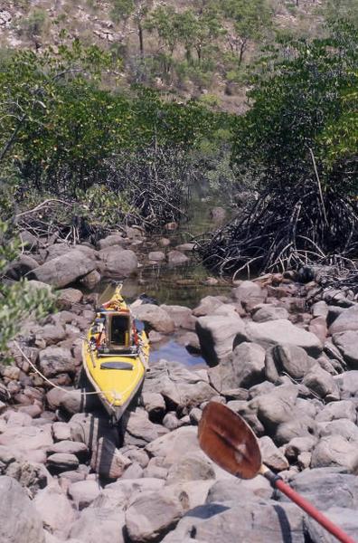 suffering from the first stages of heat exhaustion? With only half a kilometre to go I knew I had to take it easy, but I really had no choice as I was exhausted and feeling giddy. My kayak was exposed to the powerful rays of the sun and needing shade I stumbled under a mangrove tree nearby. The tide was 100 metres out and I had told Rod at Kuri Bay that I would return that afternoon. I
