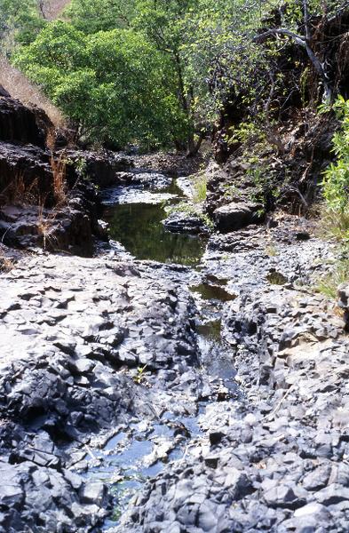 small creek home gave me more shade and several pools of water and at the junction of two creeks a small running stream flowed but disappeared several times seeping under a bed of rocky boulders. The creek at times was steep with a few large drops and good swimming holes at the bottom of them. When the mangroves appeared a trickle of water was still dripping over the rock bed. The heat was intense and I could now feel the strain on my body and my legs start to wobble.