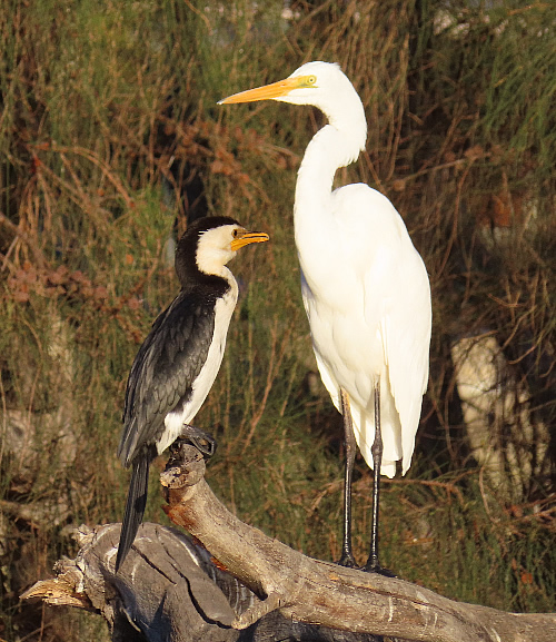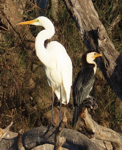 A Great Egret and a Little Pied Cormorant sharing some time together.
