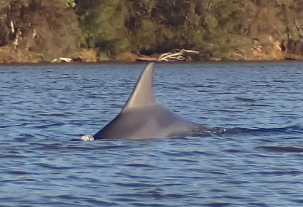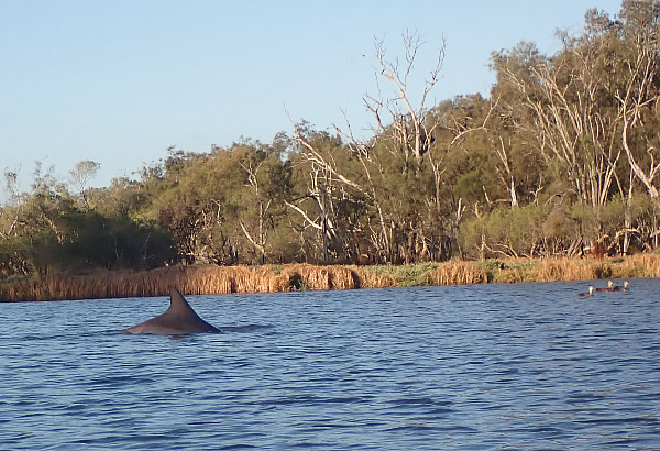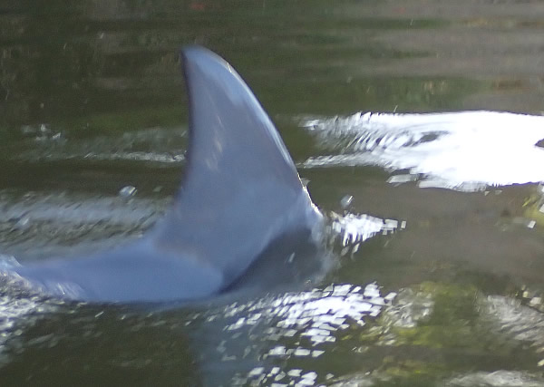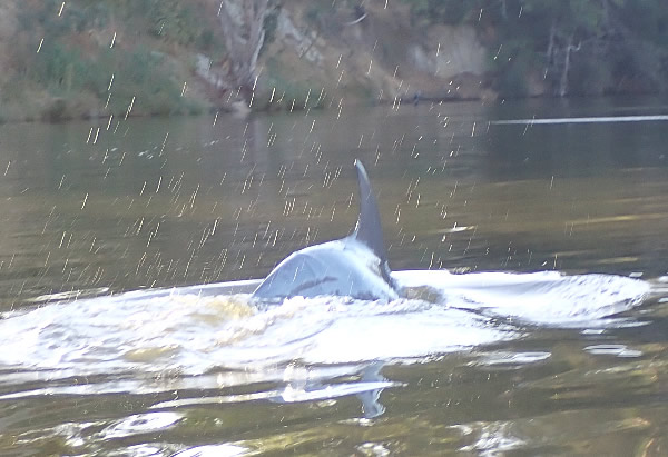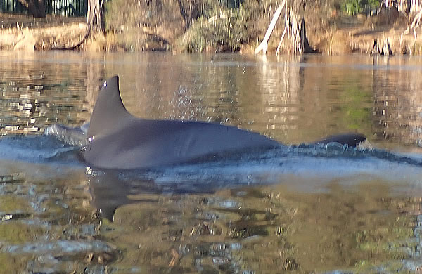 Eventually they decided to move upstream. I lost them for a moment and then one surfaced less than a metre away giving me a bit of a surprise when it surfaced and blew out to breath. At least I managed to get its photo, although a little blurred. When a dolphin surfaces for air, it breathes out (exhales) first and then breathes in (inhales) fresh air; it only takes a fraction of a second for the dolphin to do this. If you are close by, it is easy to hear a dolphin’s ‘blow’ at the surface; in fact you will often hear a dolphin before you see it! The blow is the sound you hear, and the spray of water you see, when the dolphin forcefully breathes out and clears away any water resting on top of