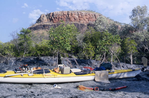 had no chance of carrying my kayak over the slimy rocks and paddle four hours back to Kuri Bay, my superman strength that I usually had, had been completely sapped by the torturous walk in the burning sun. (When I returned to Kuri Bay the following day Rod told me that I had walked the 15 or so kilometres in 39°.) Reflecting in the shade of my harrowing ordeal, twinges of cramps