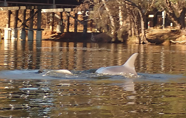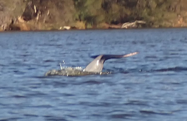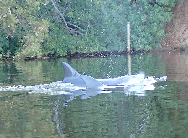 When I reached Point Reserve they were there giving all the fisher-people along each side of the river a good show. They were chasing fish and circling around. I floated in my racing kayak trying to get a picture, but they were quite elusive popping up all around me. It’s not easy trying to gauge where they are going to surface, but it’s even