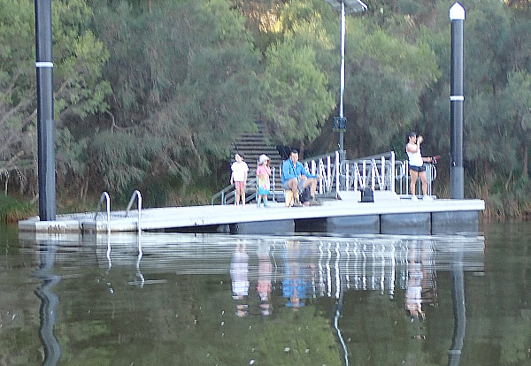 there were lots of people fishing. Every time a dolphin would surface a hand would go up and point. They moved under the water pipeline and started to pass another family fishing from the Success Hill jetty. The joy the kids and the adults got from seeing them was good to witness. A kayak fisherman was a little further. They passed him by and turned the corner of Fishmarket Reserve to