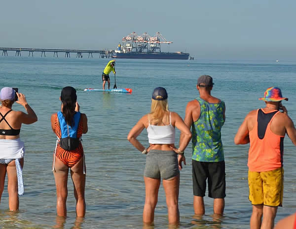A pack of paddlers passing the jetty on their first lap. Photo Geraint Madison