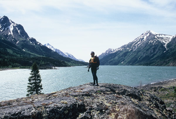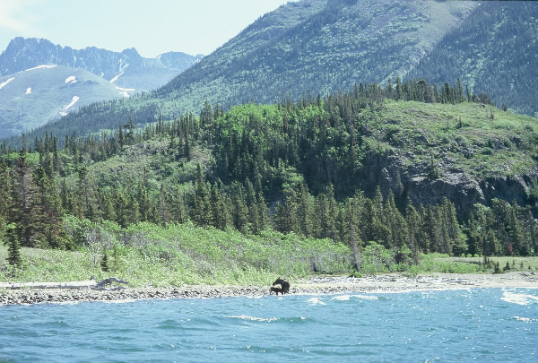 The Yukon River Twenty Years Ago Wednesday 16th June. Day 3 Despite getting up earlier at 8.00am it still took us two and a half hours to get ready and get on the water. The wind didn’t feel half as bad as the previous days and I felt a little more positive that we were going to achieve a lot more. However, once we left the shore the conditions deteriorated. As I glanced over to my left to check the shoreline, I saw a moose and two calves grazing near the water’s edge. We moved deeper into the bay to get a closer look, but the wind and waves had us fighting for stability and control. For a brief moment I got Ed to steady the canoe whilst I took out my camera and got a couple of quick shots. By this time the wind had blown us