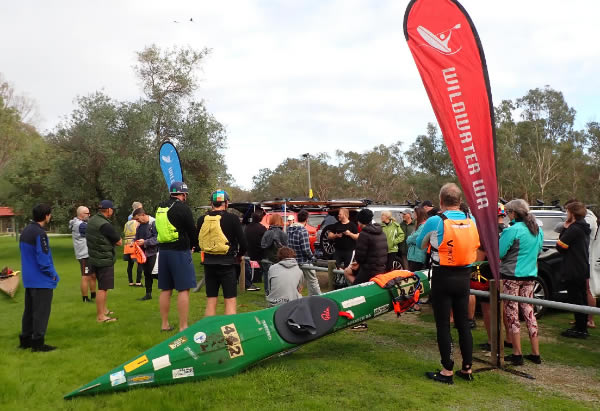 Wild Water Race #4 Drain Race Again or No Rain Race Due to a very, very low Avon River we had to run the Wild Water event back on the Upper Canning River. Although some paddlers were away and some of the regulars were not there, we still had 33 paddlers on the water. The weather was spot on and no shelter was needed to be erected. Kris & Steph Smith had us all wearing bib numbers before our