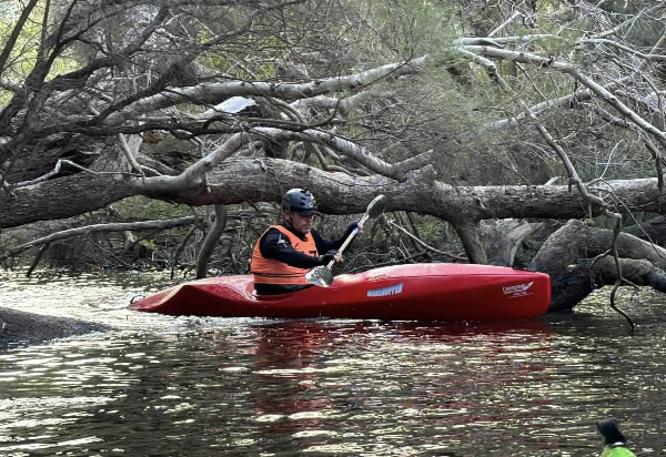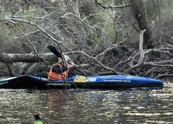 Paddling upstream and meeting a tree hazard. When all paddlers were at the start, Penny was in charge of getting us off at 30 second intervals. Two tree sections just after the start caught some paddlers off guard and became stranded on a tree trunk to shake their kayaks back and forth to try to get off it. A couple of paddlers starting behind the stuck paddlers and caught up lost a few seconds. There was also a couple of capsizes. With the water level being