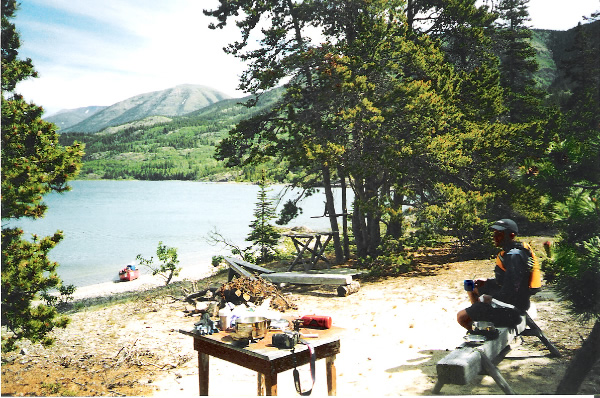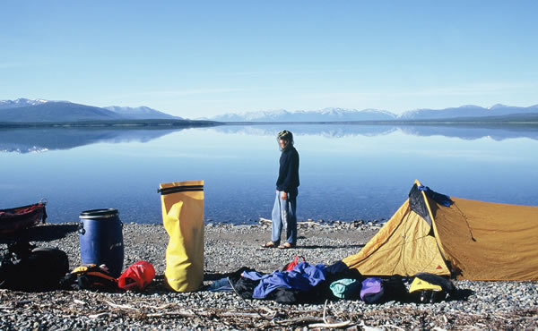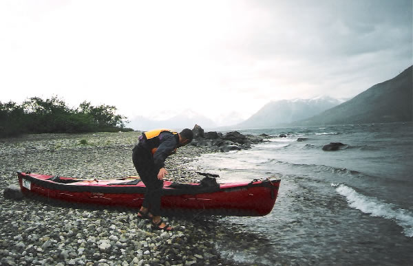 was our goal, but the wind and common sense told me that this was far enough. Paddling at 2kms an hour it could take us two days to get there. With the Yukon Race being only a week away and the fact that we were 150km from Whitehorse where it started, we really didn’t have the time to keep going. We were so close but yet still so far away. Reluctantly, we decided not to go on, but instead to turn the boat and head for Whitehorse. Why couldn’t it have been a calm day? We had lunch in the shelter of the island utilising the table and bench made from a railway sleeper. The view was stunning, the lake looked calm, and though it was a great camp site there in the friendly forest, it was too early for us to stop as we were now on our way to fulfil another goal, getting back to Whitehorse to race.