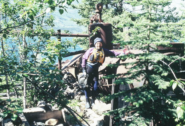 was much quicker than the way up. We were virtually flying down the lake. We were now familiar with all the points along the shore and when we came to the old hut that we had passed on the way up, we stopped to explore it. The hut had a very low roof and we just couldn’t work out why it was so low, making it impossible to stand up in, even for a short person. Alongside the hut there was a large boiler and a lot of other steel relics that had deteriorated with time and the harsh conditions.