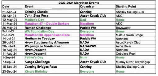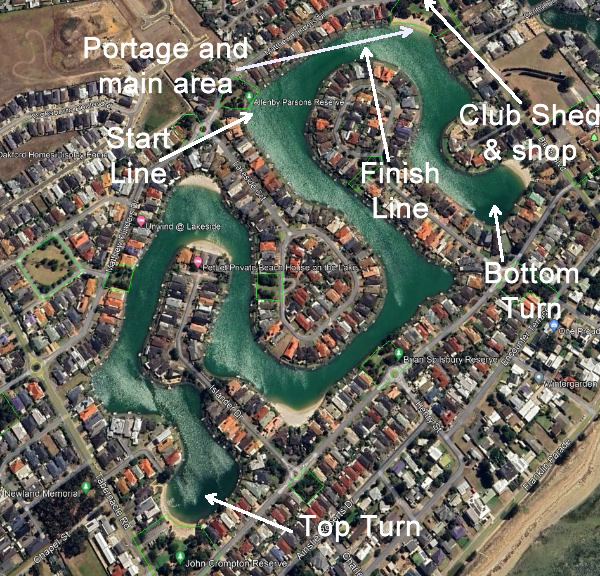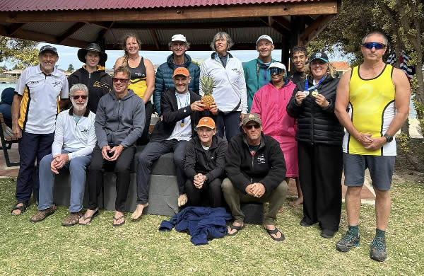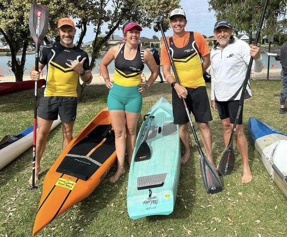 WA Report 2024 Marathon Nationals Doug Hodson - Team Manager About 1-1/2hrs south of Adelaide and about 10deg cooler, you’ll find Victor Harbour. It’s a grand old Australian town which had a really busy port during the 1800s. There’s a small kayak club there who are very proud of the water they paddle on and rightly so. It’s a man-made lake in a residential development, a sort-of chilled-out Gold Coast. It’s a double S bend with beaches, rocks, jetties, fish, the whole lot. The course ran the whole length of the lake and involved keeping right of the 60 buoys the organisers laid down the middle. WA took a team of 26, 24 kayakers and 4 SUP paddlers [a couple did both, guess which ones 😀]. Quite a few drove across. WA people think the drive to Adelaide is way easier than