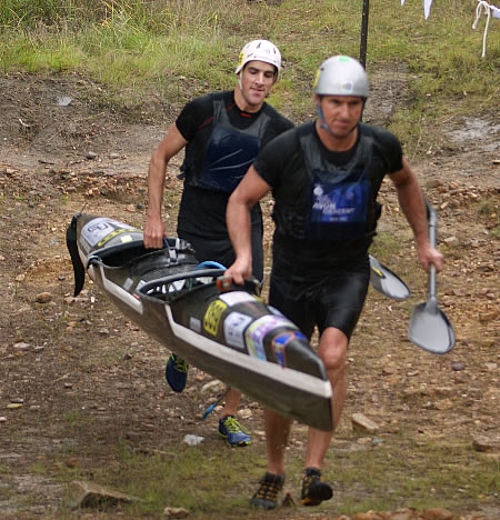 Darryl and Josh Kippin at the Avon Descent portaging Extracts Weir.