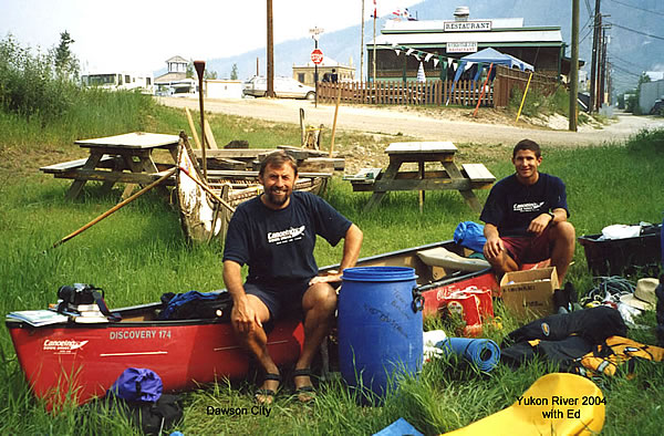 finish, to collect my kayak and take it back to his home to sell. In 2008 Ed and his wife Sue drove from Salt Lake City and picked Tony Chounding and I up at Vancouver to drive us and our canoe to Jasper where we started our 4000km trip to the Arctic Ocean. Monday 28th June 2004. Dawson. As soon as I was awake I got up to shower and then walked to the public phone to ring Jenny. I then met Ed at Klondike Kate’s café for another cheap breakfast. The specials board said, two eggs, bacon, home- made fries and toast for $4.99. You couldn’t beat that price in this tourist town. We