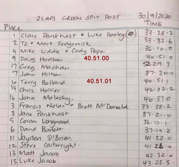 Terry So.....after 8 years = 400 races - not that he is counting, Doug beat Terry by 0.1 of a second. At the AKC Time Trial 30th September 2020.