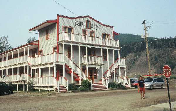 didn’t hang around after we had eaten though as all the competitors we’d befriended had left. Their journey had finished and our real journey was about to begin. Besides, I also needed to send an email at an internet café and be out of our accommodation by 11.00am. It took me over an hour to type my article and when I tried to hurry, my concentration slipped. This was only the second time that I had used an internet café and I really wasn’t confident with what I was doing. I was late back to the bunkhouse but it didn’t matter, Ed had moved all my gear out of our room. He was on the grass outside, sorting things next to our canoe. Behind him was an old large traditional canoe, big enough for ten paddlers, just waiting for someone to give it some attention. It was an inspiring sight, and I would have loved to have known and been part of its history. We had bought the majority of our food from Whitehorse but we needed to top it up in Dawson, especially fruit, vegetables and bread. We thought Dawson would have little choice and be a lot more expensive. It was more expensive but surprisingly the selection was good. Fortunately the supermarket was only a short distance away. We left our gear spread around our canoe and for the last time searched