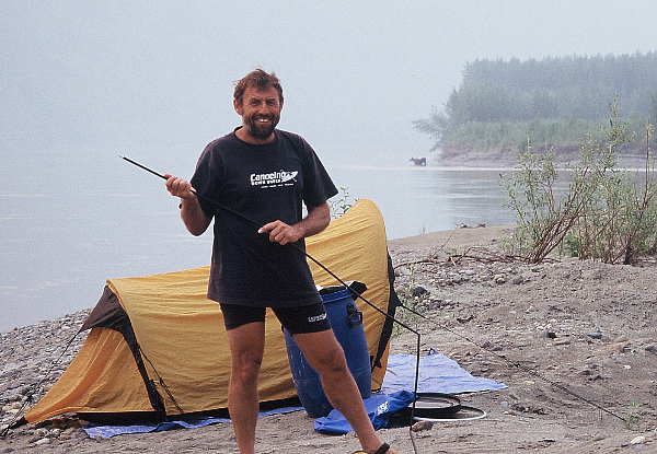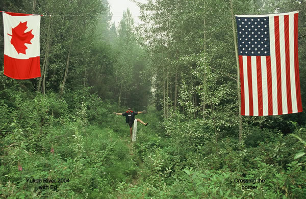 into the river. As usual, Ed was ready to get on the water first. Today was going to be a memorable day as we were going to cross the Canadian/Alaskan border. There seemed something special about crossing a country border by canoe, so we were quite excited. Our steady paddle through the smoke haze to the border didn’t take long. As we got close we watched with captivated eyes for any