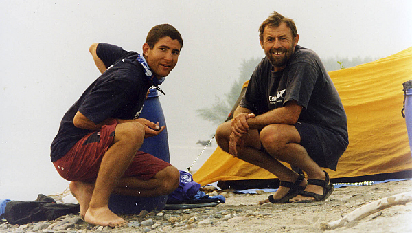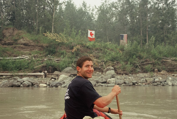 the other in Alaska. This must have been one of the most isolated border crossings and we expected that very few people would land and jump from one country to another like little kids. It was fun messing around but short lived as the mosquitoes were over us like vampires, so we soon high tailed it back to the canoe. We leapt into the canoe just happy to escape the bites, still taking photos as we were being pushed downstream into Alaska by the current and into American