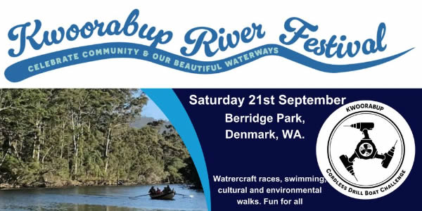 Denmark River Festival September 21st 2024 In celebration of the beautiful environment that is the Kwoorabup (Noongar for Denmark) River, Denmark Rowers are hosting a day of water craft activities and a fun swimming event combined with environmental and cultural activities for all the family. EVENTS Dragon Boat races on the Kwoorabup River. A 5km Kayak race out into the Wilson Inlet and back to Berridge Park (for adults over 16). A 1.2km swim down river from Berridge Park to the Rail Trail Bridge. First wave is competitive (wetsuits OK) and the second wave is non-competitive (wetsuits, costumes, snorkels and fins allowed) Environmental and cultural activities with information on the Kwoorabup River and its surrounds Short course paddle races over 300m in front of Berridge Park on Kayaks, Stand Up Paddle Boards and Surfboards (Longboards, Surf Skis etc) St Ayles Skiff rowing