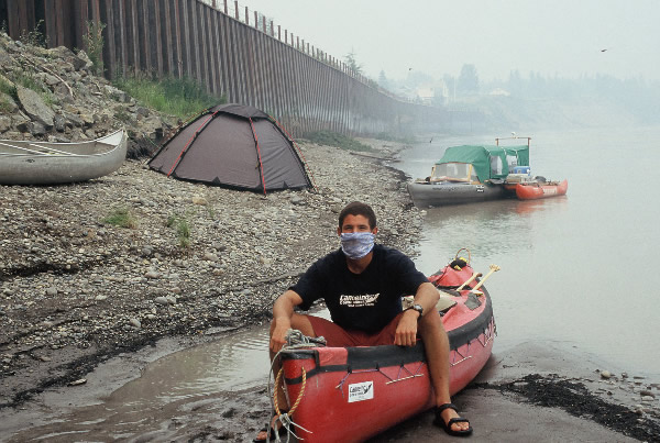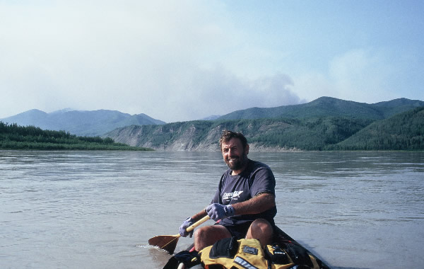 hour kayaking record that I set when I paddled 220.8kms in 24 hours on totally flat water. Soon after, we noticed new fires in the distance and we had to decide whether to stop at that point or try to paddle through the smoke to find a camp. We paddled on. On rounding a left hand corner we could see a valley carved between two mountains. We needed water and as it looked a promising