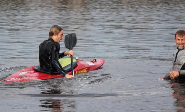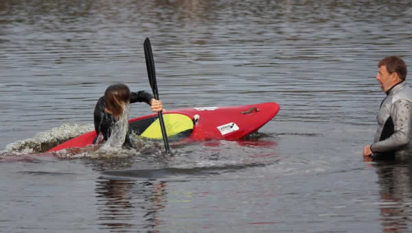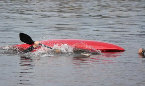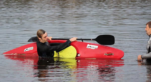 roll with me positioning his paddle and guiding it into the right position and movement. I stood by him on several attempts and with my assistance it looked promising so then I let him have a go without my assistance. Unfortunately his first time without my assistance didn’t go quite to plan. As most people find out when they try rolling for the first time, that being under water and trying to figure out what to do with their paddle is quite confusing and Luke was no different. Adding the