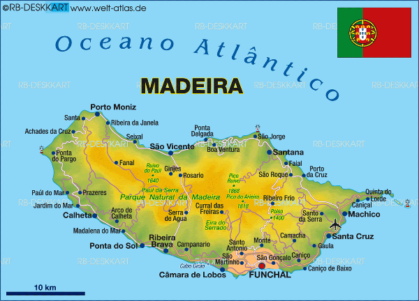 The island of Madeira has a surface area of 459 square miles (741 km2), (35 miles long and 13 miles wide). The island is 310 miles from the African coast and 620 miles from the European continent, which is the equivalent of a 1 hour 30 minute flight from Lisbon. The archipelago, discovered by the Portuguese in 1418, is made up of the islands of Madeira, Porto Santo and the uninhabited islands of Selvagens and Desertas. Because of their privileged geographical position and