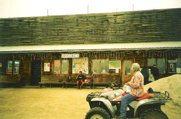 passports from our bags, climbed the track to the top of the wall and walked towards the buildings, one of which was the store and the other a café. I bought some bread, cheese and muffins for lunch, two more rolls of film, a tube of sun screen and two cokes and we sat on the bench outside the store to eat them. A notice board on the outside wall of the store had maps and locations of the fires that were burning out of control. It was a distressing image; the fires were breaking out on several fronts all over Alaska. A woman came to the public phone box and called her friend, I overheard her saying that she was stranded in the village and wasn’t able to leave. She said that the closest fire was coming toward the town from all directions