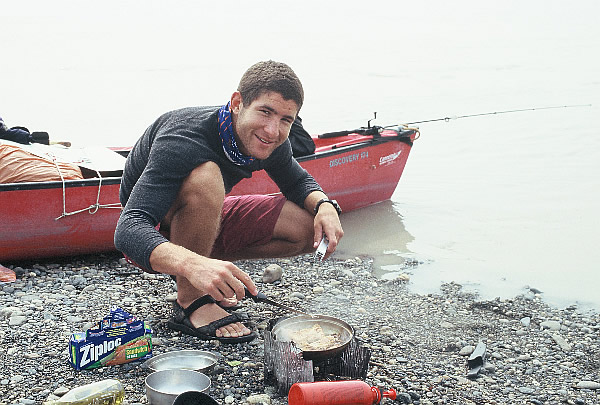 Ed cooking dinner. He brought his fishing rod but he had no success fishing in the silty water.