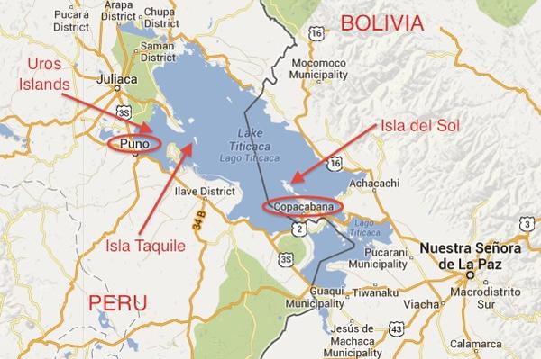 Lake Titicaca Peru and Bolivia Highest navigable lake in the world Lake Titicaca is located on the border between Peru and Bolivia. It is the highest navigable lake in the world, at an altitude of 3,812 meters above sea level (numerous smaller lakes around the world are at higher elevations). With a