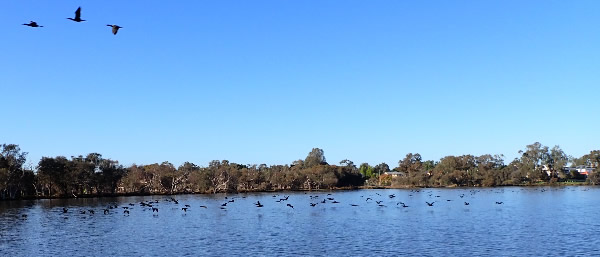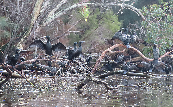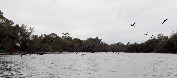 When not feeding they gather in large numbers in trees along the river. Although they are black they are also quite a pretty bird, with wide, green eyes and with feathers on their back with a greenish shine. These overlapping feathers create a beautiful pattern. They have a grey hooked bill and fairly big grey/black webbed feet. When the winter feeding frenzy season is finished on the Swan River they will disappear leaving only small groups to make the Swan River their home for the rest of the year. Like the Darter after leaving the water they will perch on a tree branch, post or any other type of perch and