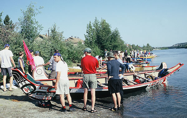 survive the journey whilst keeping it to a minimum too. All canoes had to be fitted with spray decks due to the potential rough crossing of Lake Laberge. Every other team was actively sorting their gear. The big Voyageur canoes that held 6 – 8 paddlers were the most impressive and the most difficult to organise. Many of the canoe teams looked like serious racers, so we really felt like