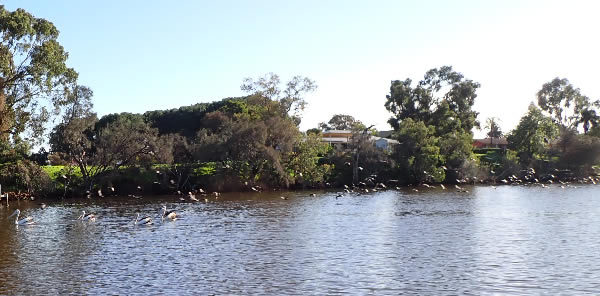 paddle that day, we were in no hurry. Dominating the river were high sand cliffs which appeared and disappeared all along the way. A few houses stood prominently on top of the big cliffs and so close to the cliff edge that I could envisage erosion would have them falling into the river in a few years’ time. Just before lunch we came across some people mingling on a jetty belonging to a huge mansion. It had an immaculate green lawn right down to the water’s edge creating a great camp site. We passed them slowly in the hope of an invitation but nothing was forthcoming. Further along in a small cove, a guy was leaving a jetty in an old looking boat/raft with the words ‘Gold Rush Tours’ on the side. Two dogs followed it by running along the bank and through the