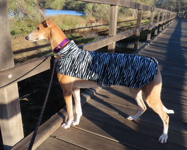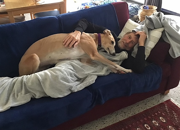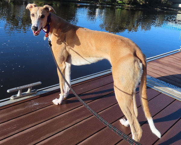 Meet Leena We have another rescued greyhound. Her name is Leena. She is five years old and has been racing. She is great. She is very inquisitive and will stand like a statue looking at paddlers go by, or any other thing that takes her attention. She is very loving. When she is awake she always wants a cuddle or a stroke. She comes to me when I'm trying to put the newsletter together and will expect me to stroke her all day. Jenny is very happy.