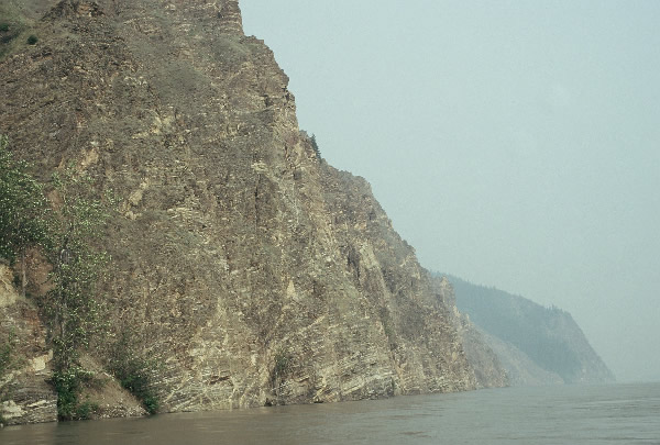 bluffs and cliffs, but the beauty of it all was spoiled by the smoke. I just wished our river maps had contours that indicated the mountains, – I might have been able to pin point our position, but the maps were only pen drawings and didn’t show the terrain. We paddled on and on becoming more and more concerned that we hadn’t reached our destination. Just the fact that I told Ed that we were close had kept him alive, but as the kilometres dragged on our spirits began to