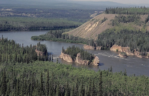 our next obstacle, the Five Finger Rapids some 38kms away. These rapids were the only real hazard along our route apart from the lake. Five Finger Rapid apparently splits into several channels, the safest being the right one. I had seen pictures of it on the internet, a wide river with several high cliffy islands across the river. As we closed in on the rapids the adrenalin began to pump, and although very confident with our skills we were not going to take any unnecessary chances to get an
